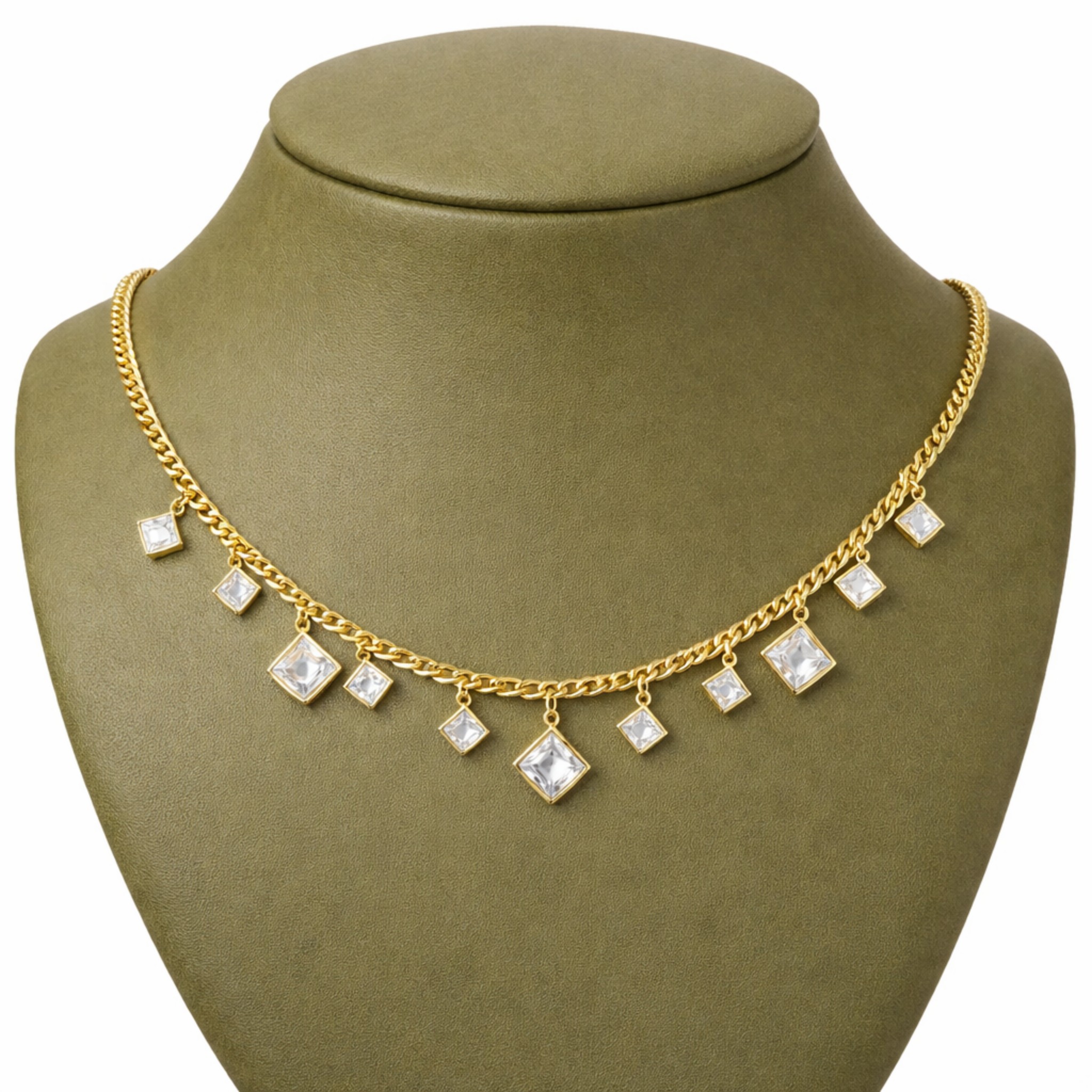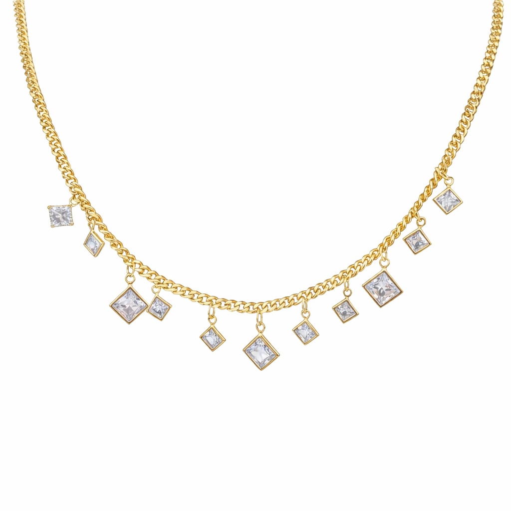 Wyjątkowy naszyjnik, który przyciąga spojrzenia subtelnym blaskiem i wyrafinowaną formą. Złoty łańcuszek o eleganckim splocie został ozdobiony delikatnymi zawieszkami z cyrkoniami, które pięknie odbijają światło i nadają całości luksusowego charakteru.
