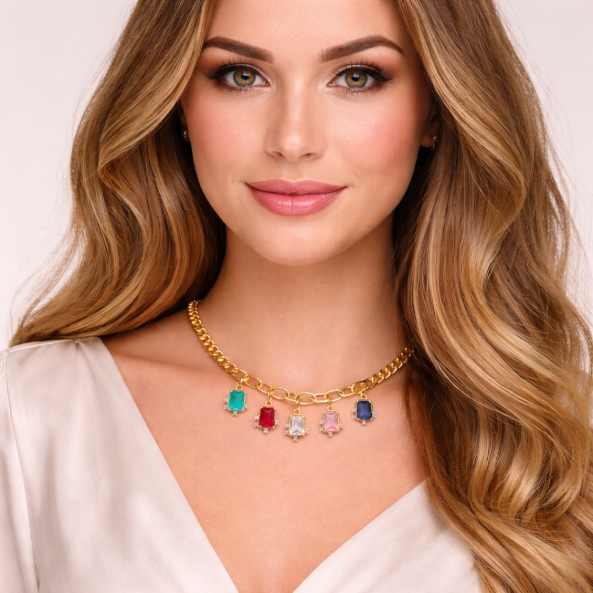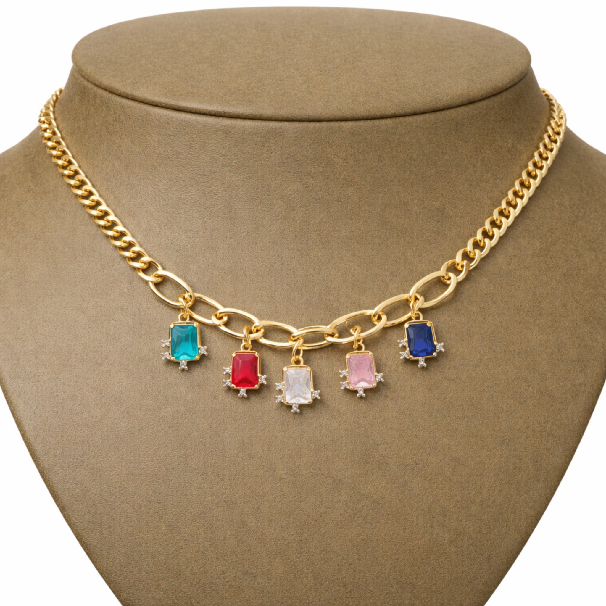 Ten model przyciąga spojrzenia od pierwszej chwili. Złoty łańcuszek o wyrazistym splocie został wzbogacony o zawieszki z kolorowymi cyrkoniami, które tworzą efektowną i nowoczesną kompozycję.