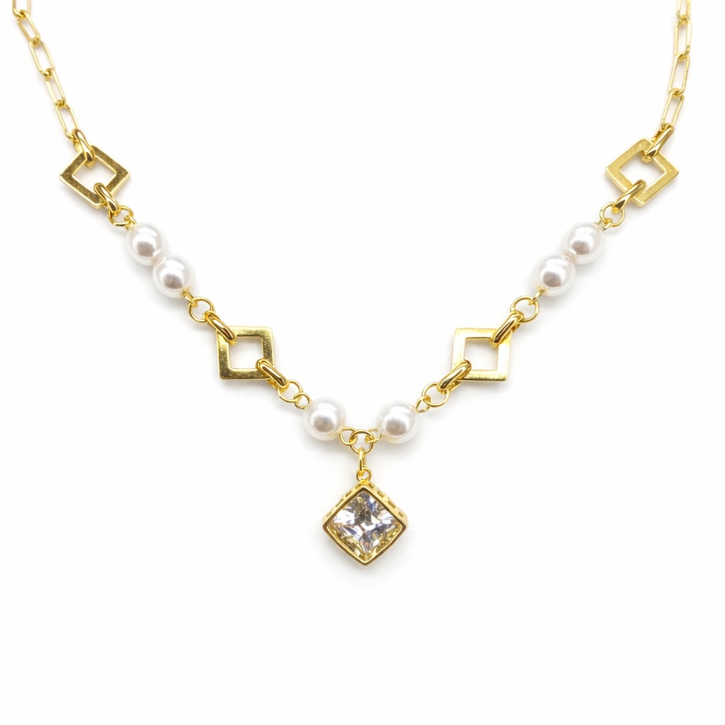 Wyjątkowy naszyjnik, który łączy klasyczną delikatność z nowoczesnym designem. Złoty łańcuszek został wzbogacony o subtelne perełki oraz geometryczne elementy, tworząc harmonijną i przyciągającą uwagę kompozycję.