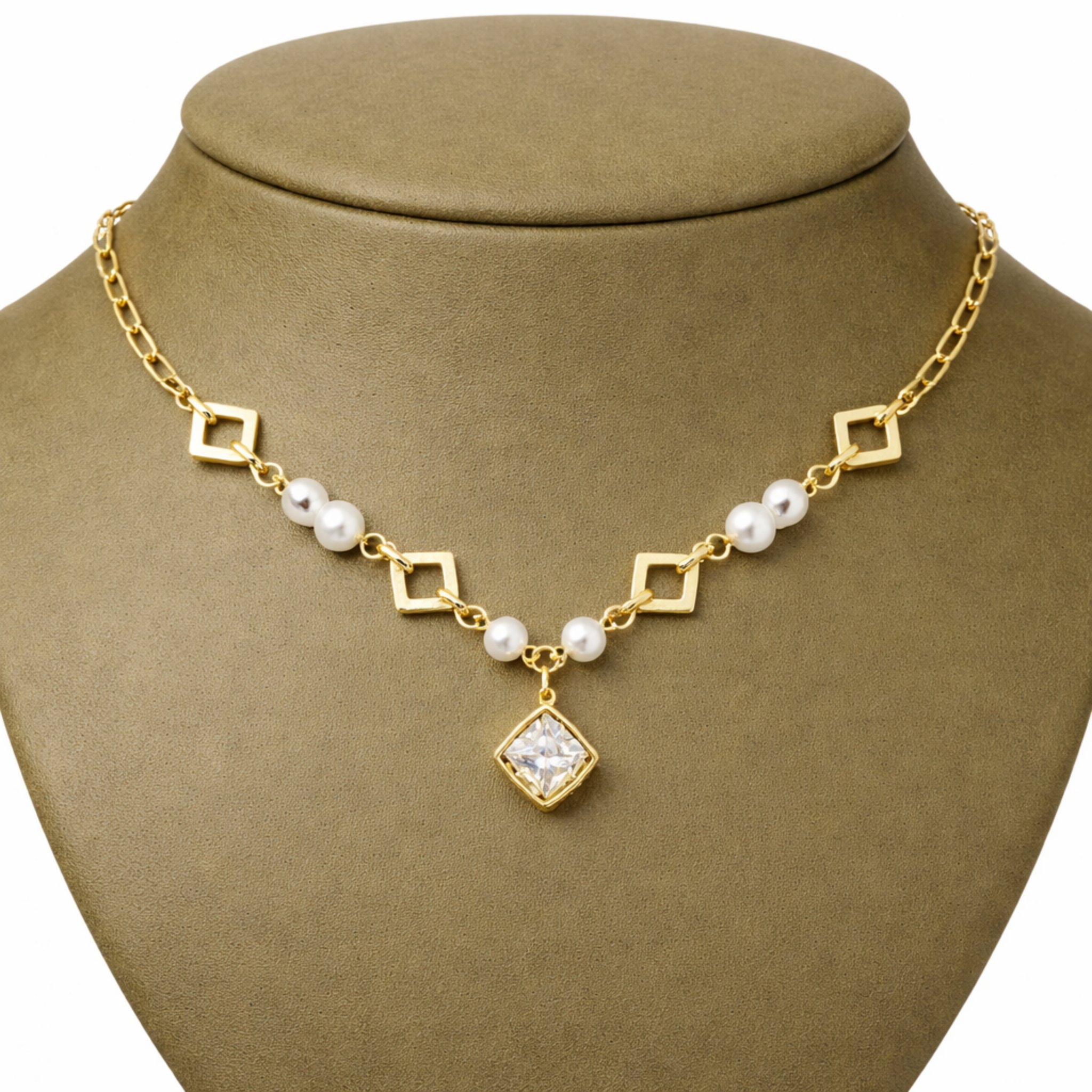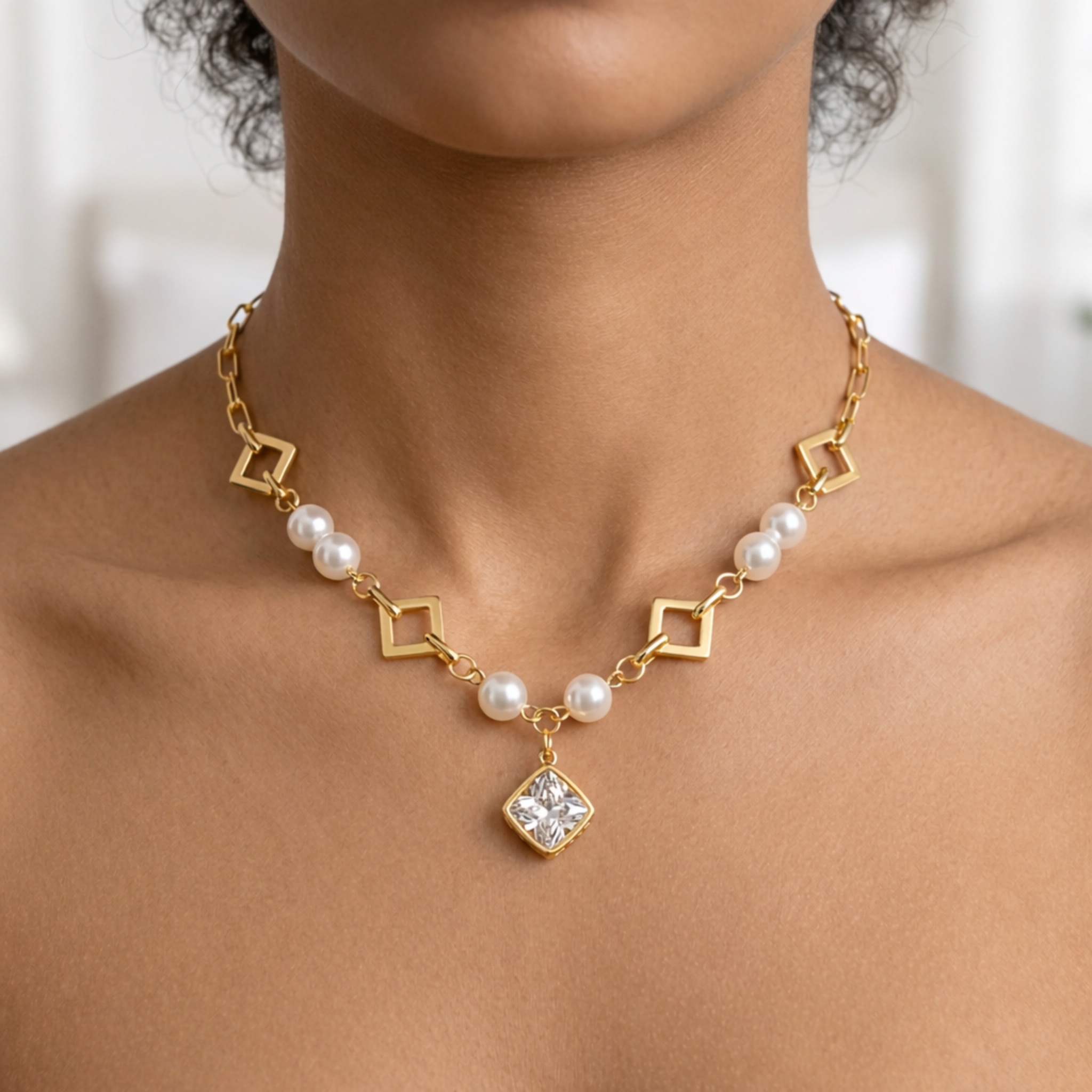 Centralnym punktem biżuterii jest elegancka zawieszka o geometrycznej formie, która dodaje całości wyrafinowanego charakteru. Połączenie klasycznych perełek z nowoczesnym kształtem sprawia, że naszyjnik doskonale wpisuje się w aktualne trendy.