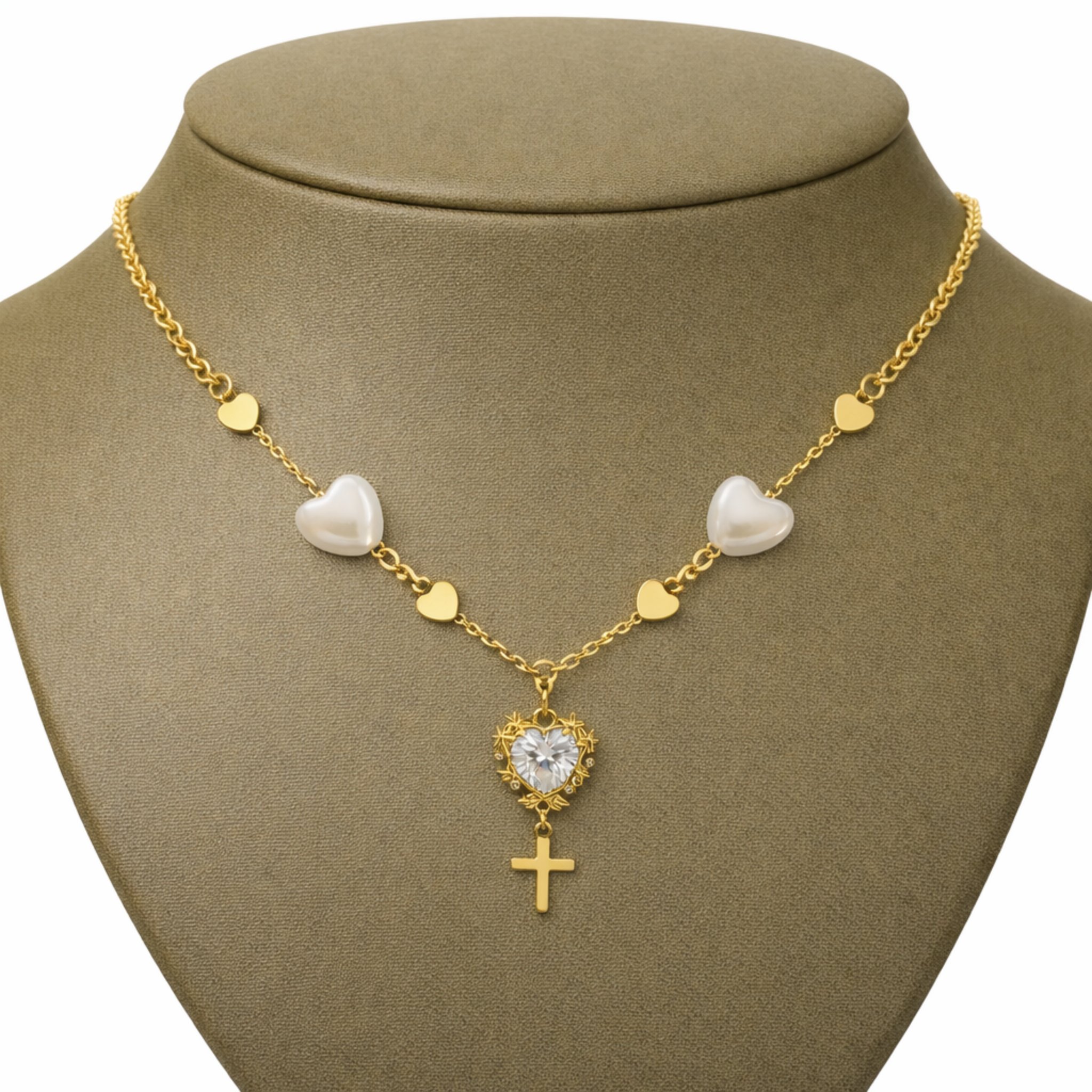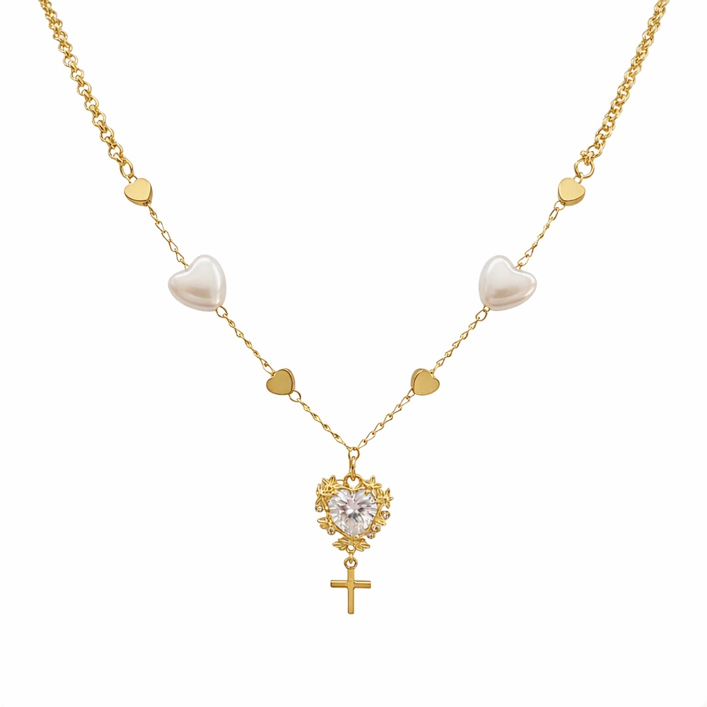 Wyjątkowy naszyjnik, który łączy subtelną kobiecość z eleganckim wykończeniem. Delikatny złoty łańcuszek został ozdobiony sercami oraz perłowymi akcentami, które nadają całości lekkości i romantycznego charakteru.