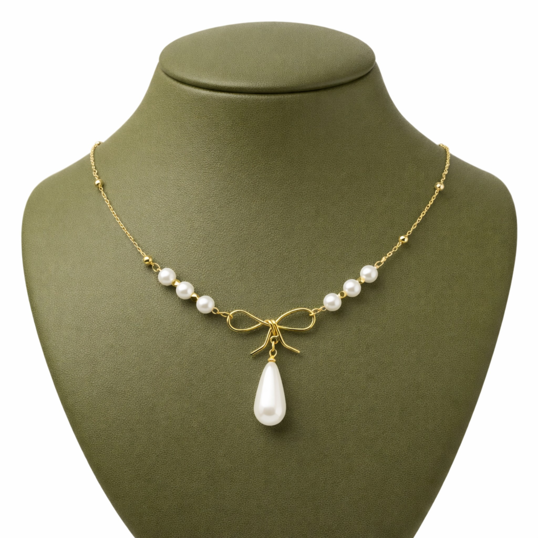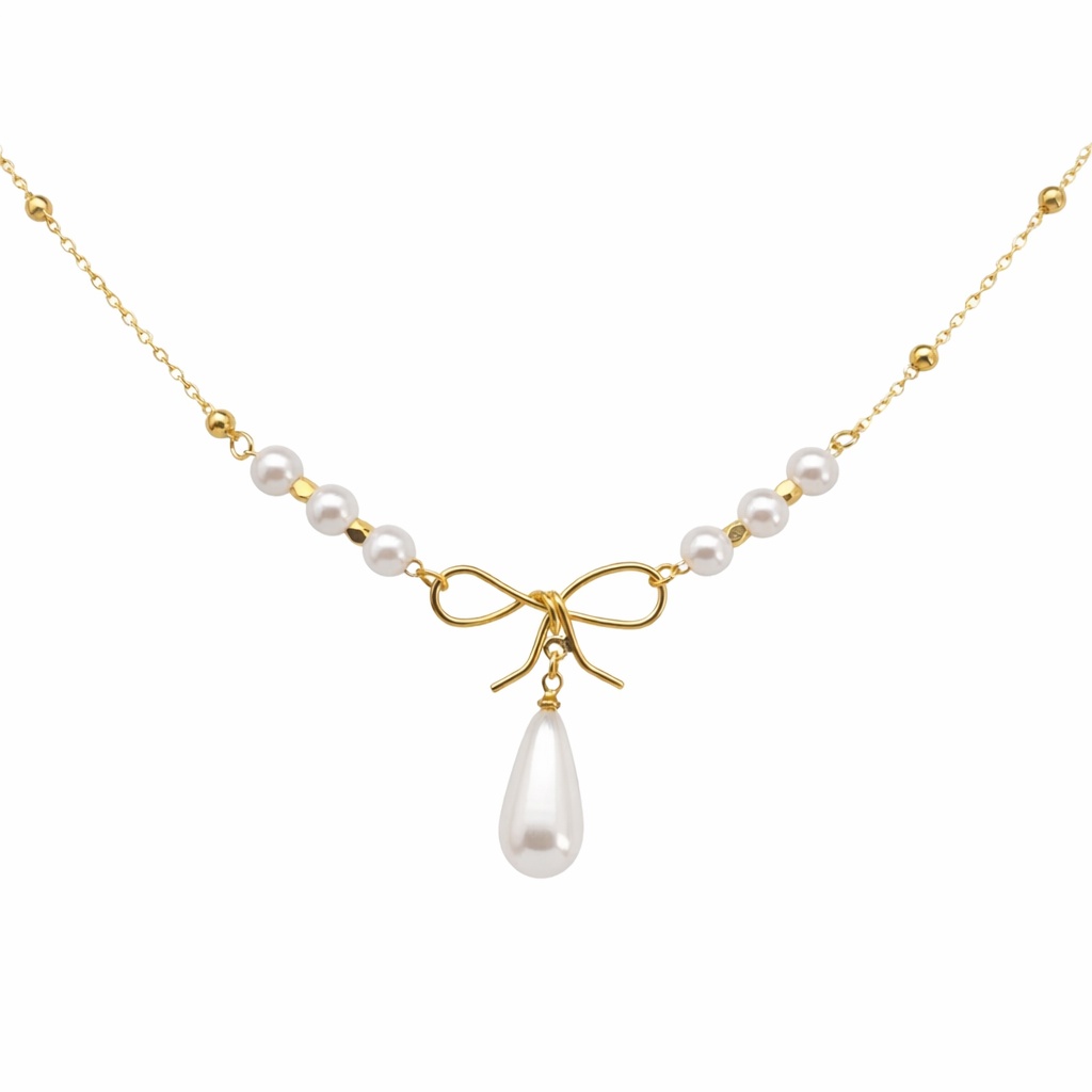 Centralnym elementem jest dekoracyjna kokardka, zakończona elegancką zawieszką w formie kropli. To połączenie tworzy niezwykle harmonijną kompozycję – romantyczną, a jednocześnie wyrafinowaną.