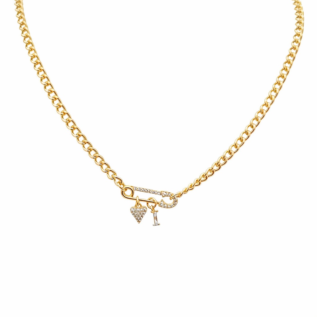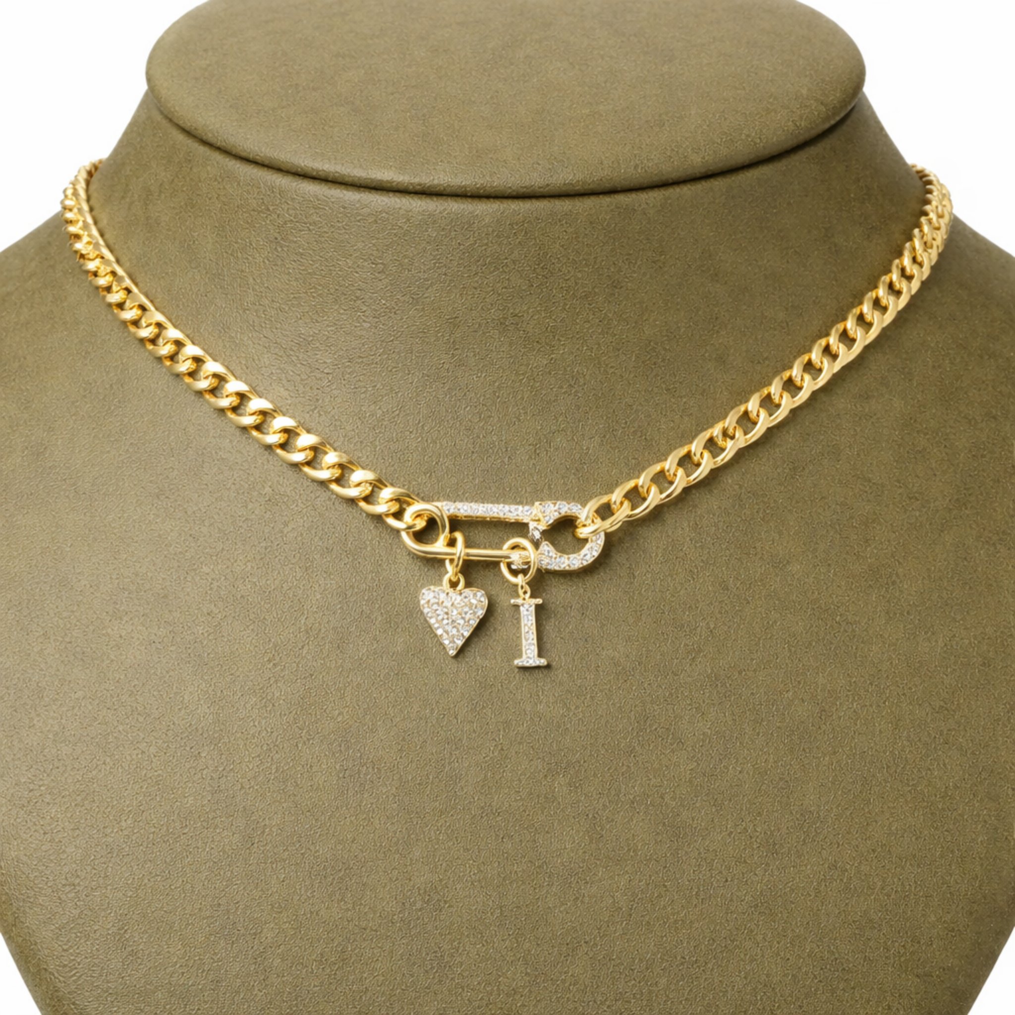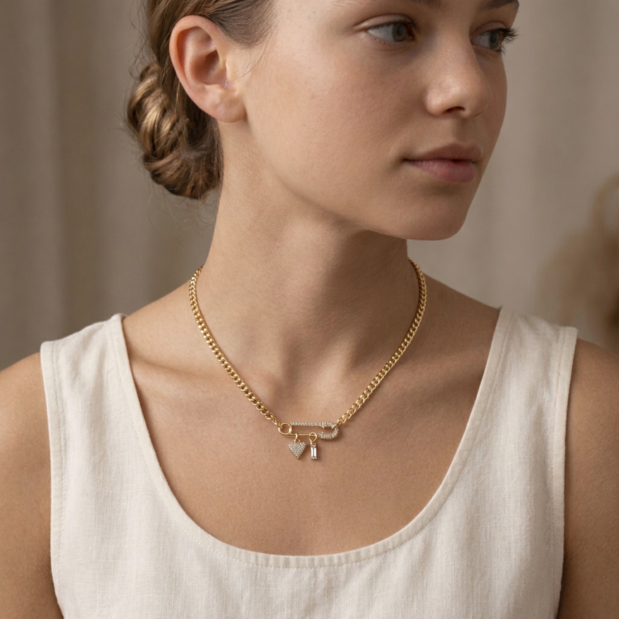 Stylowy naszyjnik, który wyróżnia się nowoczesnym designem i dopracowanymi detalami. Złoty łańcuszek o wyrazistym splocie został uzupełniony ozdobnym zapięciem z delikatnym połyskiem cyrkonii, tworząc efekt eleganckiej i przyciągającej uwagę kompozycji.