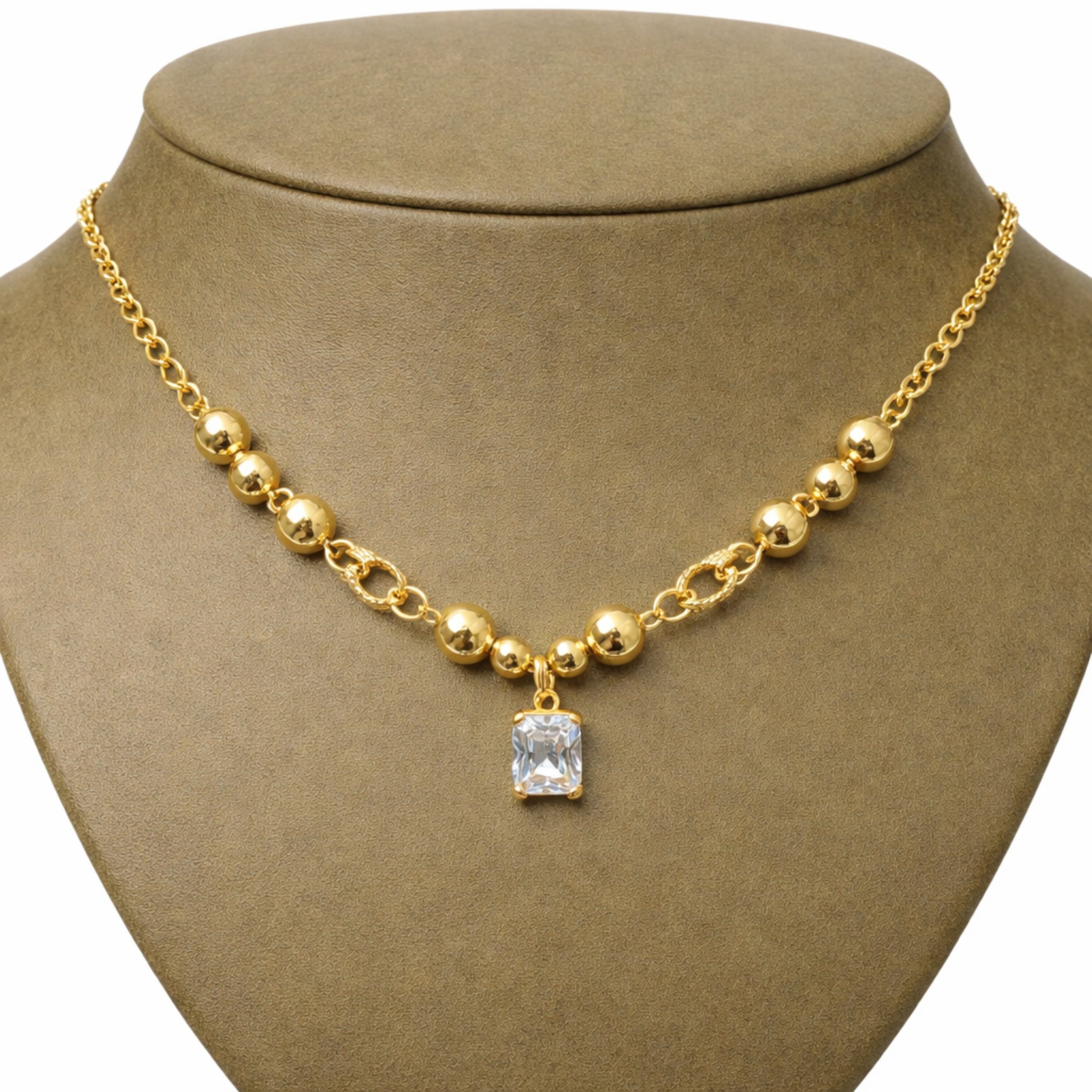 Centralnym punktem jest zawieszka z cyrkonią o geometrycznym kształcie, która pięknie odbija światło i stanowi wyrazisty akcent całej kompozycji. To biżuteria, która doskonale podkreśla styl i dodaje elegancji każdej stylizacji.